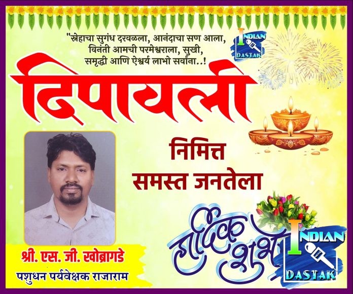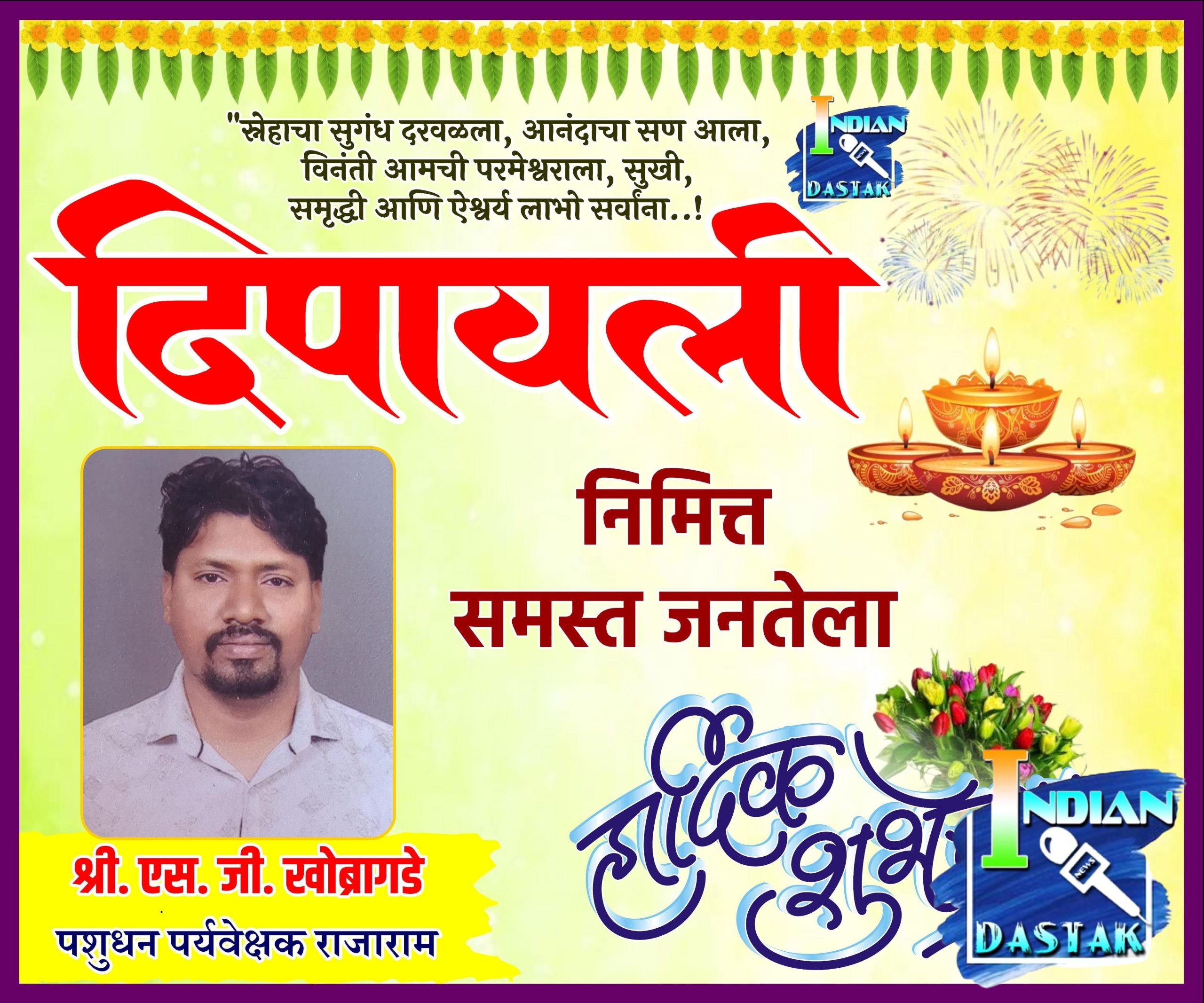 गडचिरोल्लीदिपावली व भाऊबिज निमित्त जिल्हा वासियांना हार्दिक शुभेच्छाBy Indian Dastak - October 16, 202544ShareFacebookTwitterWhatsApp दिपावली व भाऊबिज निमित्त जिल्हा वासियांना हार्दिक शुभेच्छाशुभेच्छूक : श्री,एस.जी.खोब्रागडे पशुधन पर्यवेक्षक राजाराम
