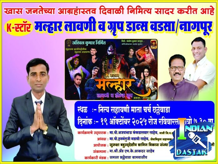 अहेरी तालुक्यातील छल्लेवाडा येथे खास जनतेचा आग्रहाचे व विनंती वरून दिवाळीचाओचित्य साधून सादर करीत आहेत के -स्टार मल्हार लावणी व डान्सग्रुप आयोजित करण्यात आले आहे.या कार्यक्रमाचे अध्यक्ष म्हणून सेवानिवृत्त सहाय्यक वनरक्षक, तसेच महाराष्ट्र प्रदेश काँग्रेस कमिटीचे सचिव