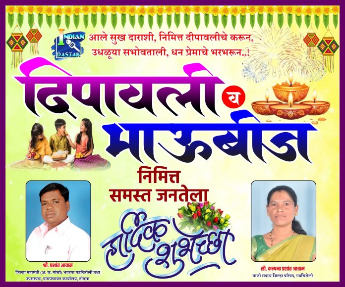 दिपावली निमित्त समस्त जनतेला हाँर्दिक शुभेच्छा शुभेच्छुक: श्री.प्रशांत आत्राम जि.महामंत्री(अ.ज.मोर्चा)भाजपा गडचिरोल्ली तथा उपसरपंच ग्रामपंचायत कार्यलय तोडसा व सौ.कल्पना प्र.आत्राम माजी सदस्य जि.प.गडचिरोल्ली