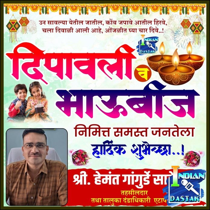 एटापल्लीदिपावली निमित्त समस्त जनतेला हाँर्दिक शुभेच्छा शुभेच्छुक: श्री.हेमंत गांगर्डे साहेब तहसीलदार तथा तालुका दंडधिकारी एटापल्लीBy Indian Dastak - October 20, 202570ShareFacebookTwitterWhatsApp दिपावली निमित्त समस्त जनतेला हाँर्दिक शुभेच्छाशुभेच्छुक: श्री.हेमंत गांगर्डे साहेब तहसीलदार तथा तालुका दंडधिकारी एटापल्ली