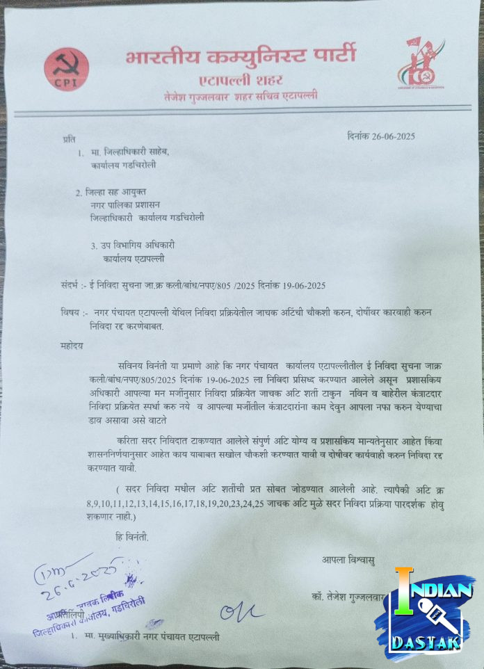 एटापल्ली (ता. २६ जून २०२५) — एटापल्ली नगर पंचायतने सध्या काढलेल्या घनकचरा व्यवस्थापनाच्या ई-निविदेमध्ये अतिशय जाचक अटी घालून नव्या व लहान ठेकेदारांना बाहेर ठेवण्याचा प्रयत्न सुरू आहे, असा गंभीर आरोप भारतीय कम्युनिस्ट पक्षाने (CPI) केला आहे. या संदर्भात भाकपचे शहर सचिव कॉ. तेजेश गुज्जलवार यांनी जिल्हाधिकारी गडचिरोली, जिल्हा उपआयुक्त (नगर प्रशासन) आणि उपविभागीय अधिकारी एटापल्ली यांच्याकडे निवेदन सादर केले.