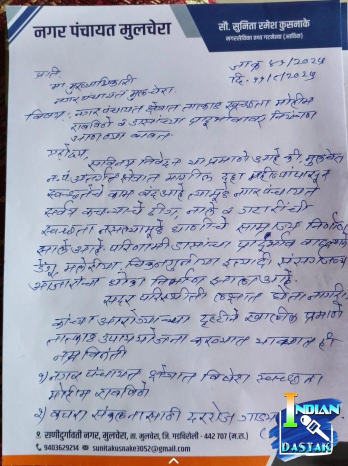 मुलचेरा नगर पंचायत क्षेत्रामध्ये गत दहा महिने स्वच्छतागृह, कचरा संकलन, रस्त्यांवरील साफसफाईसाठी कोणतीही कामे होत नसल्याचा परिसरवासीयांनी तक्रार केली आहे. स्वच्छता ही नागरिकांच्या आरोग्याशी थेट संबंधित बाब असून स्वच्छतेवर या वेळेत झालेला उत्स्फूर्तपणा गंभीर समस्या निर्माण करत आहे. कचऱ्याचा साठा वाढल्यामुळे दुर्गंधी, विषारी वातावरण आणि रोगांचा धोका वाढला आहे.