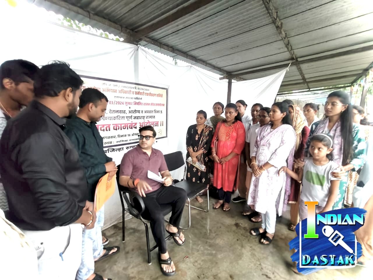 *अहेरी:-* राष्ट्रीय आरोग्य अभियानातील (एनएचएम) कंत्राटी अधिकारी व कर्मचारी यांच्या उपजिल्हा रुग्णालय व तालुका आरोग्य केंन्द्र समोर अहेरी येथे सुरू असलेल्या बेमुद्दत कामबंद आंदोलन स्थळी भेट देवून आंदोलनाच्या मागण्या जाणून घेतल्या.महाराष्ट्र शासनाच्या दि. १४/०३/२०२४ रोजीच्या निर्णयानुसार नियमित शासन सेवेत समायोजनाची प्रक्रिया शासनाने थांबवून ठेवलेली असून ती त्वरित पार पाडावी व ज्यांना 10 वर्षे झालेली नाही अशांना बदली धोरण, वेतनवाढ, ईपीएफ, आरोग्य व अपघात विमा आदी लागू करण्याच्या मागणीसाठी “बेमुदत कामबंद” आंदोलन सुरू केले आहे.त्यांच्या मागण्यांबद्दल चर्चा करण्यात आली व आपल्या मागण्या रास्त असल्याचे सांगुन शासनापर्यंत पोहचवून त्वरीत मार्ग काढण्यासाठी पाठपुरावा करू असे माजी पालकमंत्री राजे अम्ब्रिशराव महाराज यांनी सांगीतले.